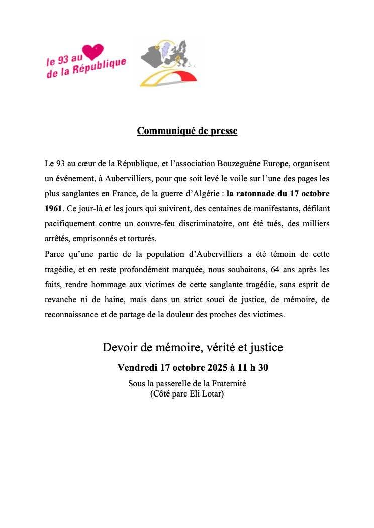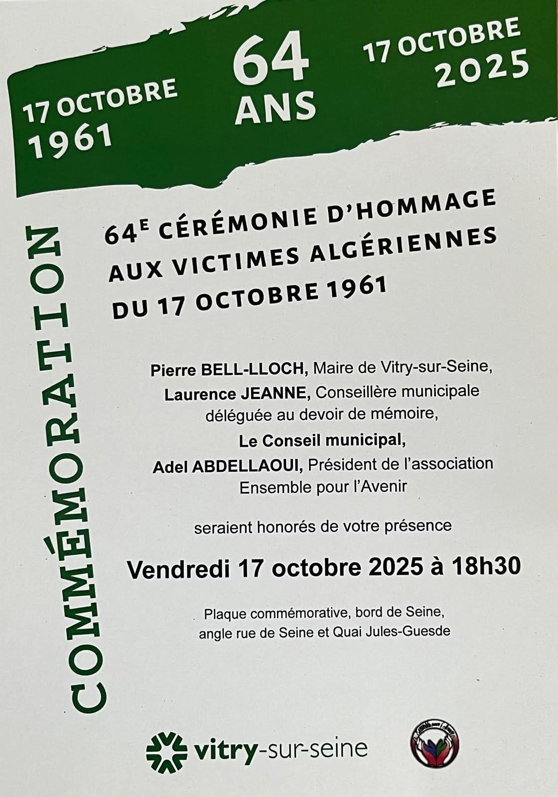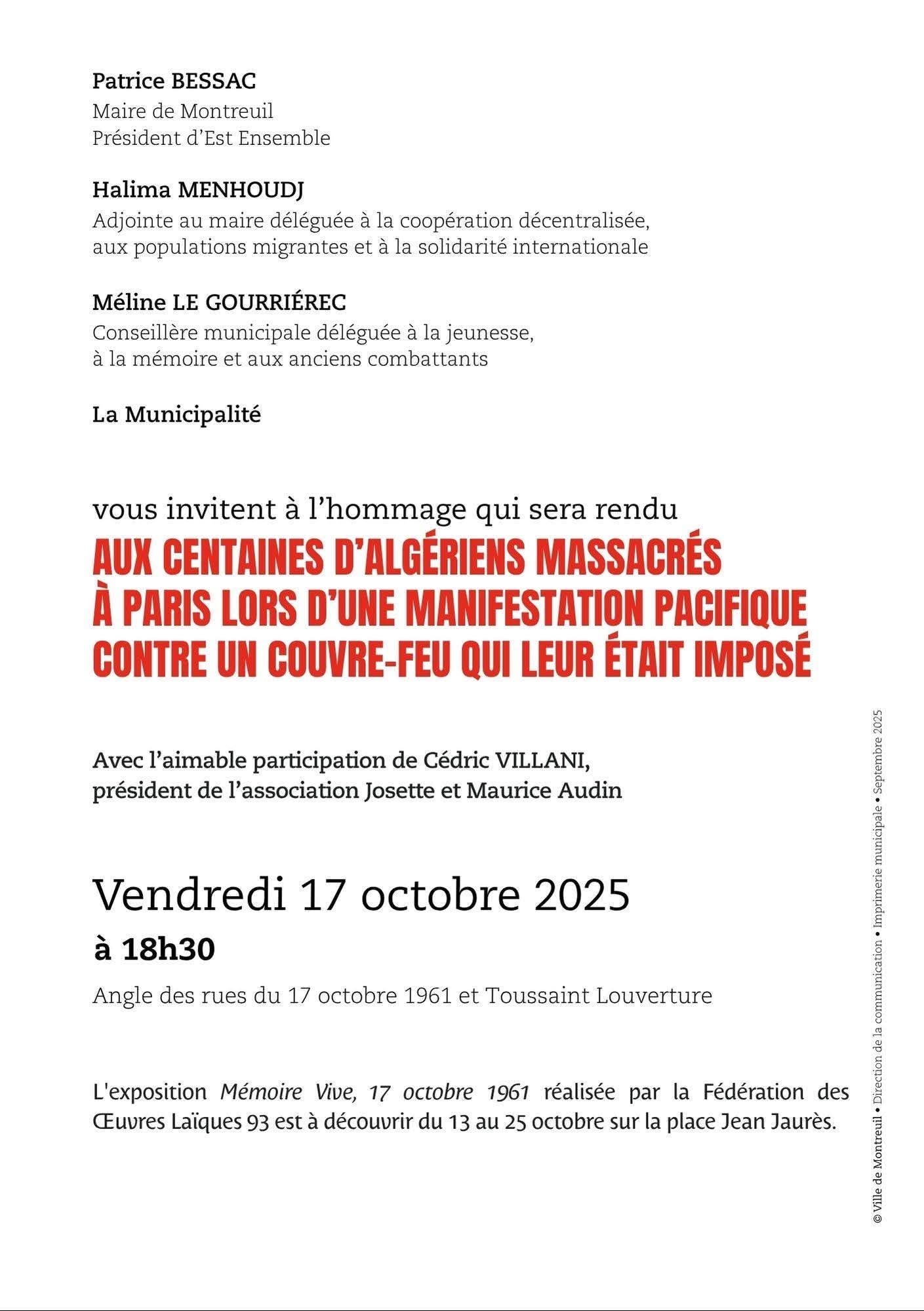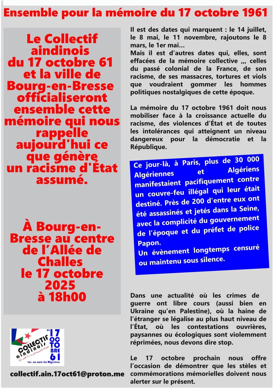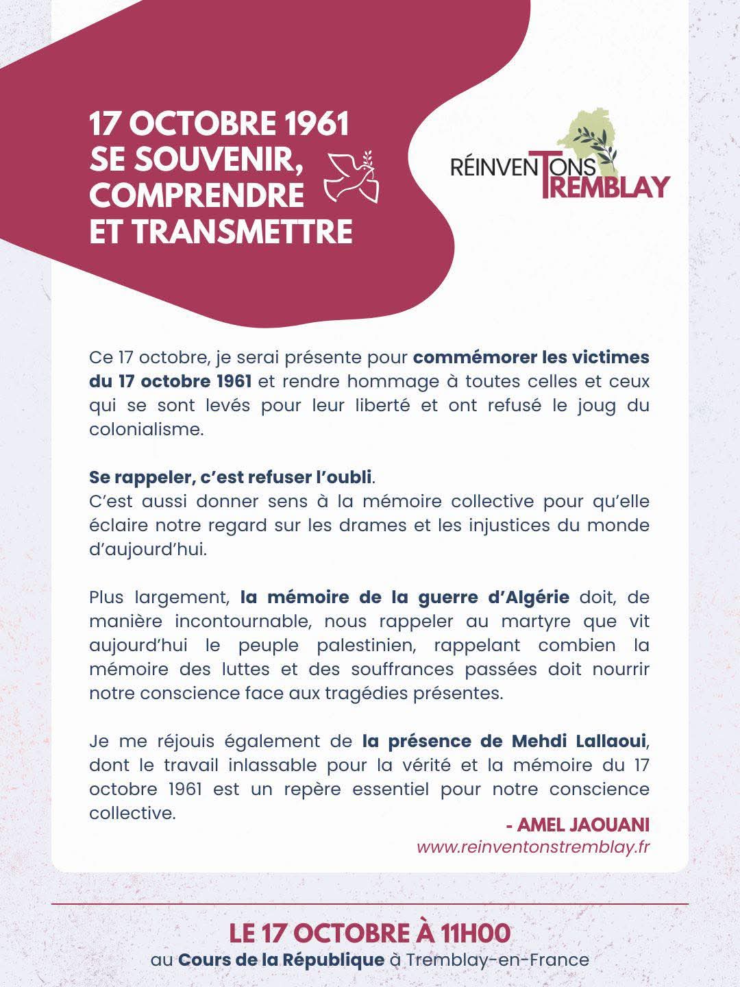 - Obtenir que la journée du 17 octobre 1961 (massacre des algériens à Paris) soit déclarée : Journée nationale anticoloniale ( l’abolition du système colonial)