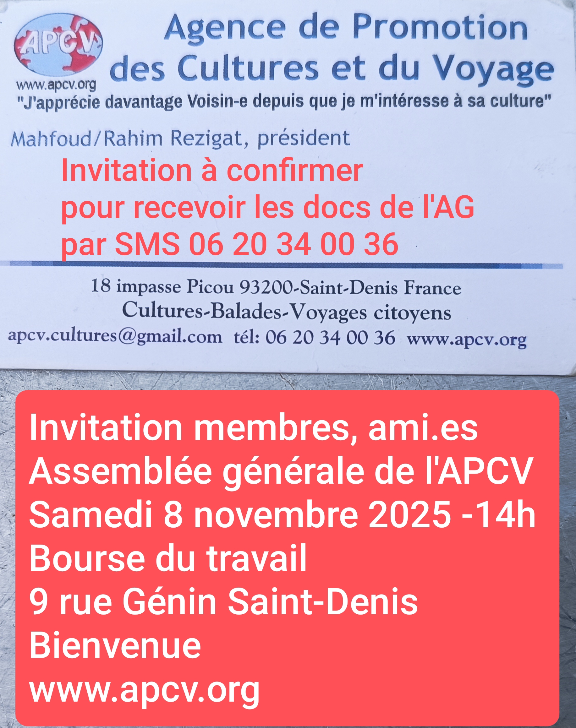 L’APCV a pour objectif : La promotion des cultures et du voyage favorisant la relation, l’échange et le dialogue entre les cultures par des rencontres, des colloques, des spectacles, des voyages, des échanges culturels et sportifs afin de mieux communiquer ensemble.